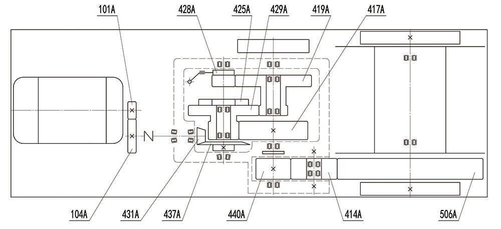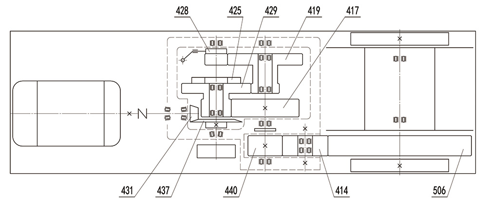 减速箱是绞车的传动心脏,共有两种速度。图示为快速传动位置,其快速传动位置是第一级闭式圆柱齿轮传动的小齿轮(图号428)与内齿圈联接,从而实现快速传动,此时三轴上的双联齿轮(图号419)空转。搬动调速手把,将第一级圆柱小齿轮(图号428)滑移到与三轴双联齿轮(图号419)的大端啮合,则实现绞车的慢速传动。齿轮位置详见图(2)传动系统图。