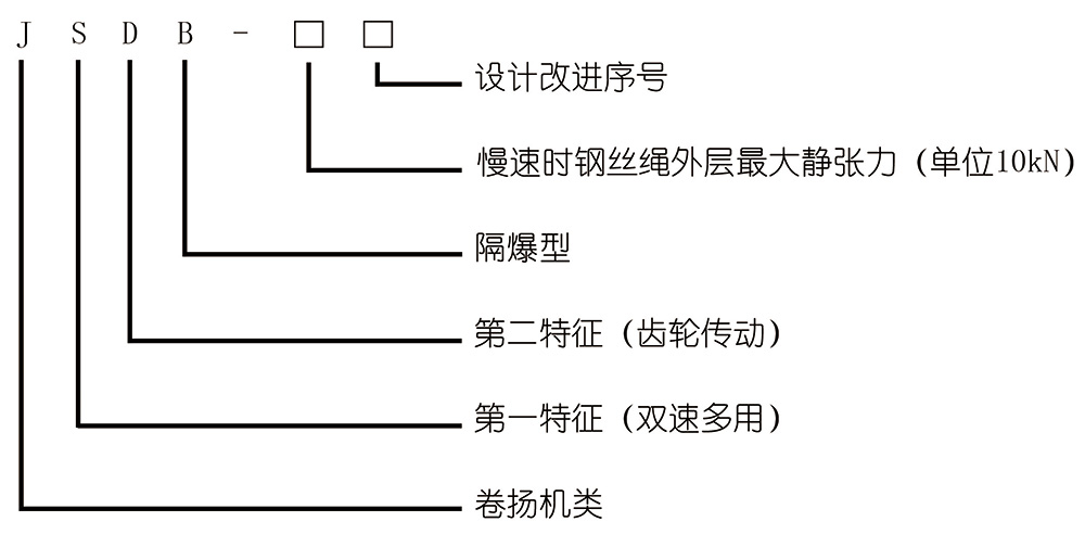JSDB改进型系列绞车有JSDB-10A、JSDB-13A、JSDB-16A、JSDB-19A、JSDB-25A,表示改进型双速多用绞车,慢速时钢丝绳外层最大静张力分别为100kN、130kN、160kN、190kN、250kN。