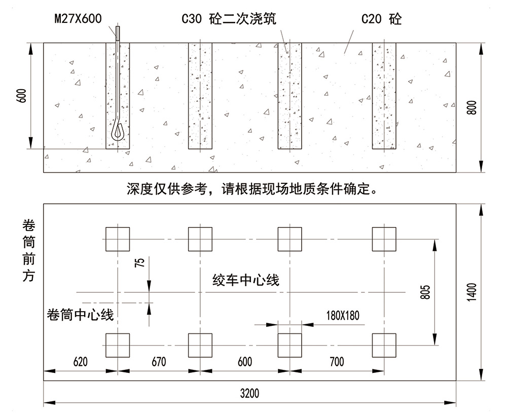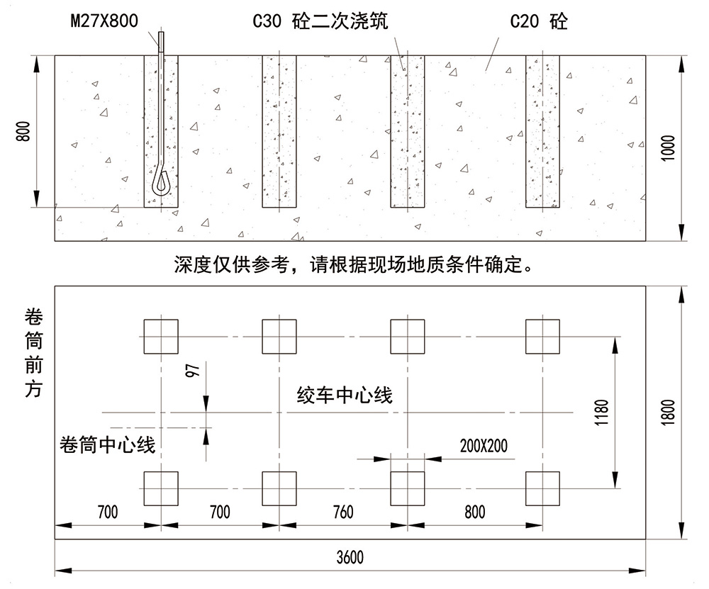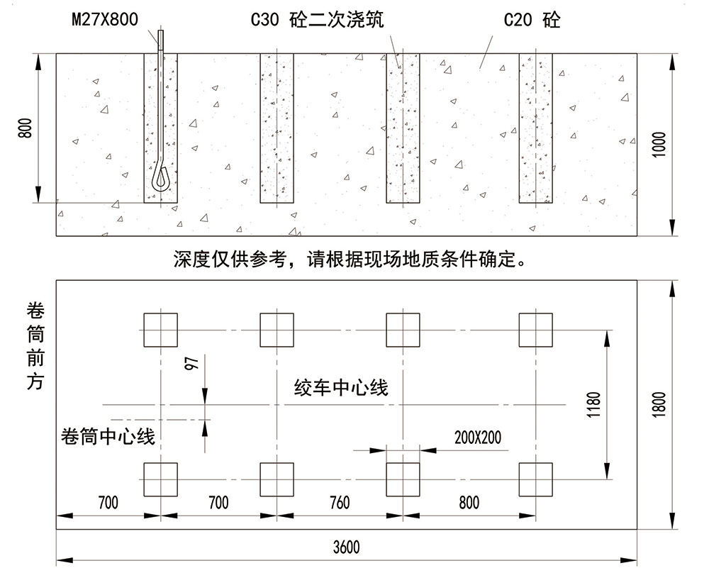 本绞车常用的固定方法见图(4)、图(5)、图(6),绞车固定后应牢固、可靠、不得有松动现象。